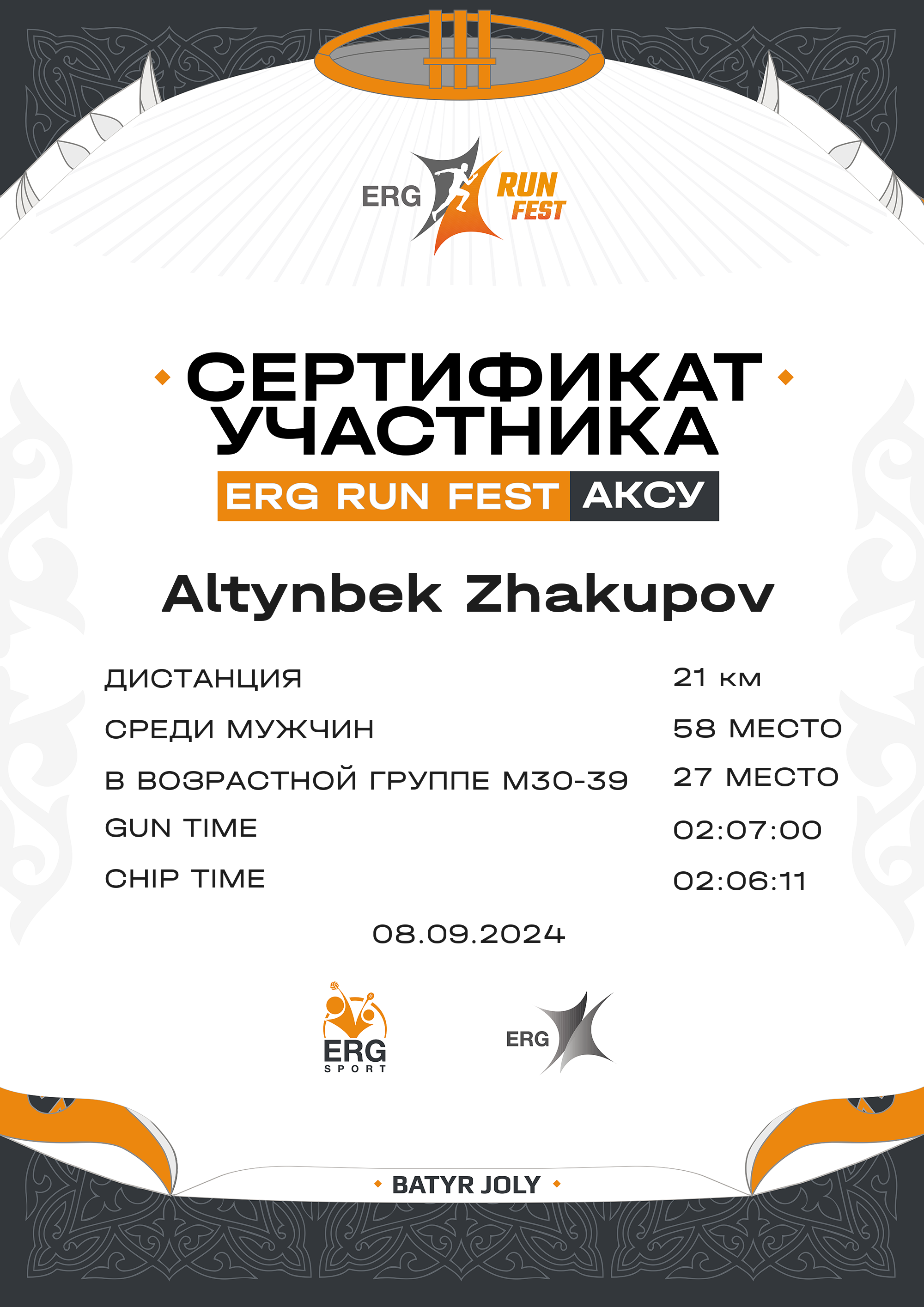 | 64 | Altynbek Zhakupov | ![]() | Павлодар | 45 | 00:06:57.00 | 00:19:02.00 | 00:35:05.00 | 00:48:23.00 | 01:05:21.00 | 01:19:41.00 | 01:38:03.00 | 01:53:03.00 | 02:07:00 | 02:06:11 | 5:58 | Скачать |