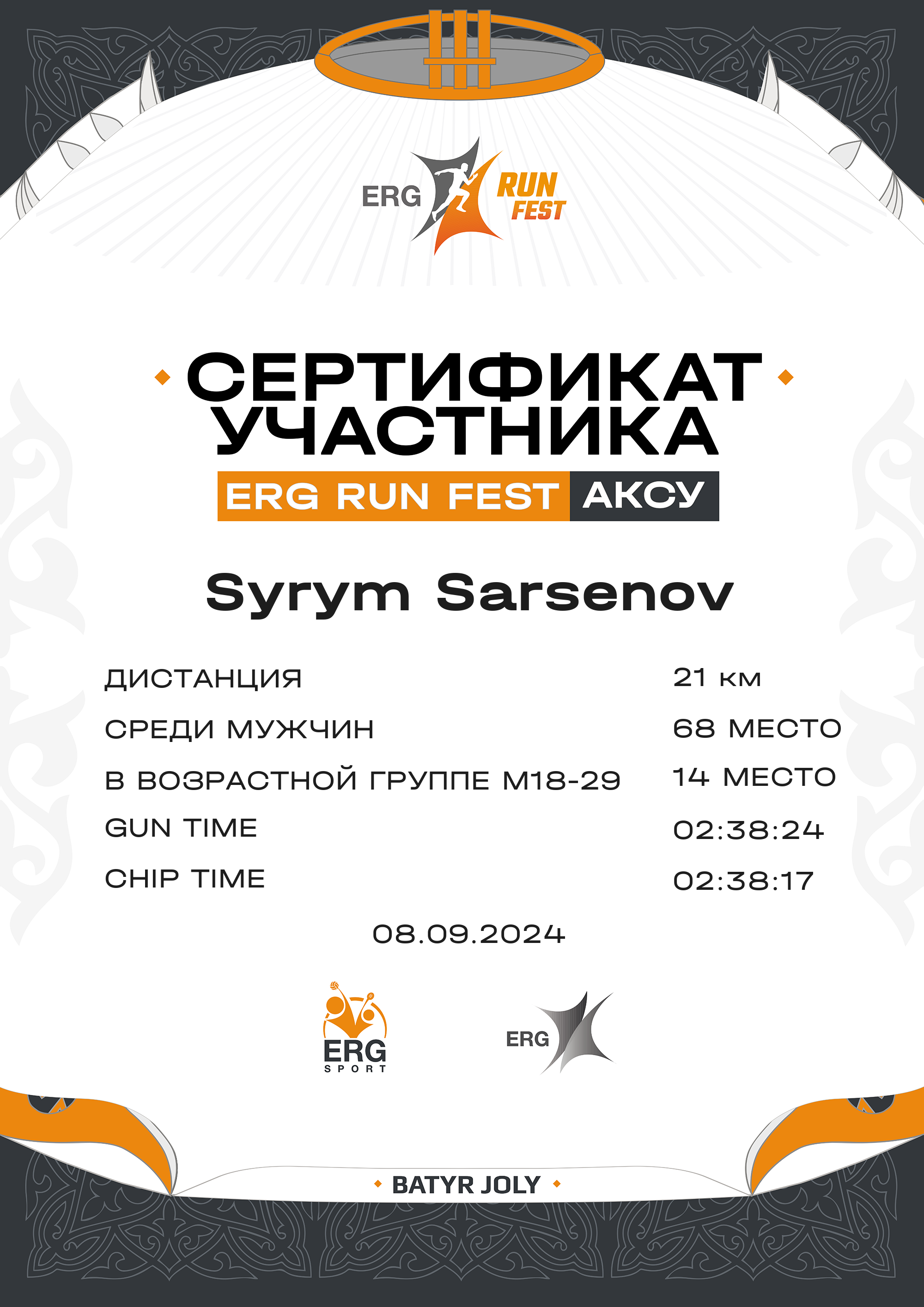 | 80 | Syrym Sarsenov | ![]() | Павлодар | 56 | 00:07:48.00 | 00:22:15.00 | 00:41:29.00 | 00:57:41.00 | 01:19:16.00 | 01:37:59.00 | 02:02:02.00 | 02:22:07.00 | 02:38:24 | 02:38:17 | 7:30 | Скачать |