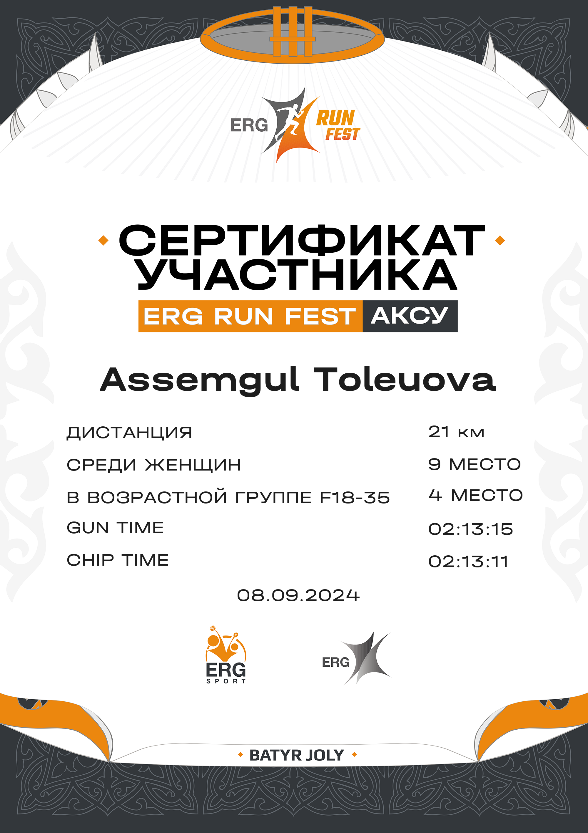 | Орын | Қатысушы | Ел | Город | Номер | 1.3 km | 3.6 km | 6.5 km | 8.8 km | 11.7 km | 14.0 km | 17.1 km | 19.4 km | Финиш | Chip time | Pace | Сертификат |