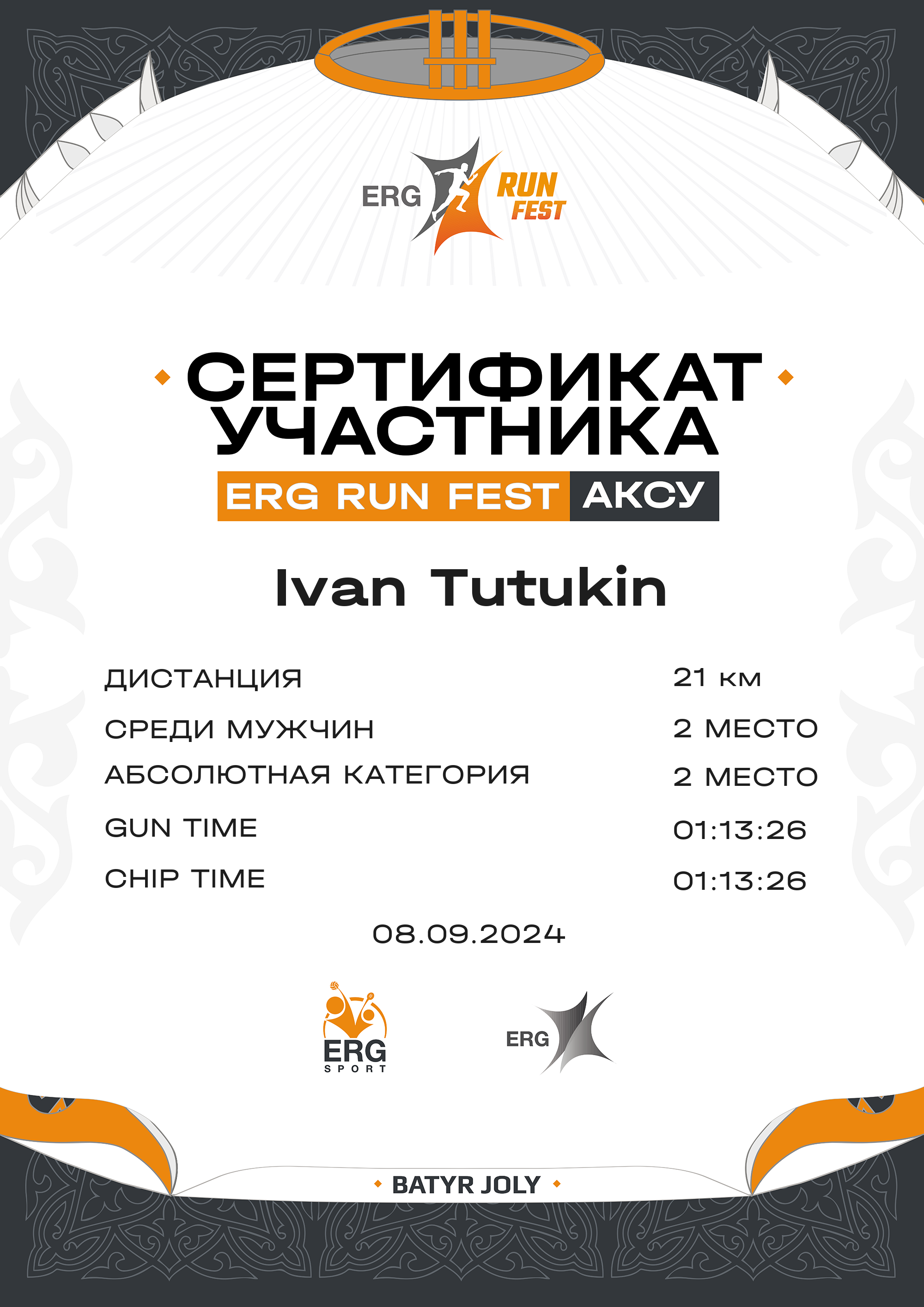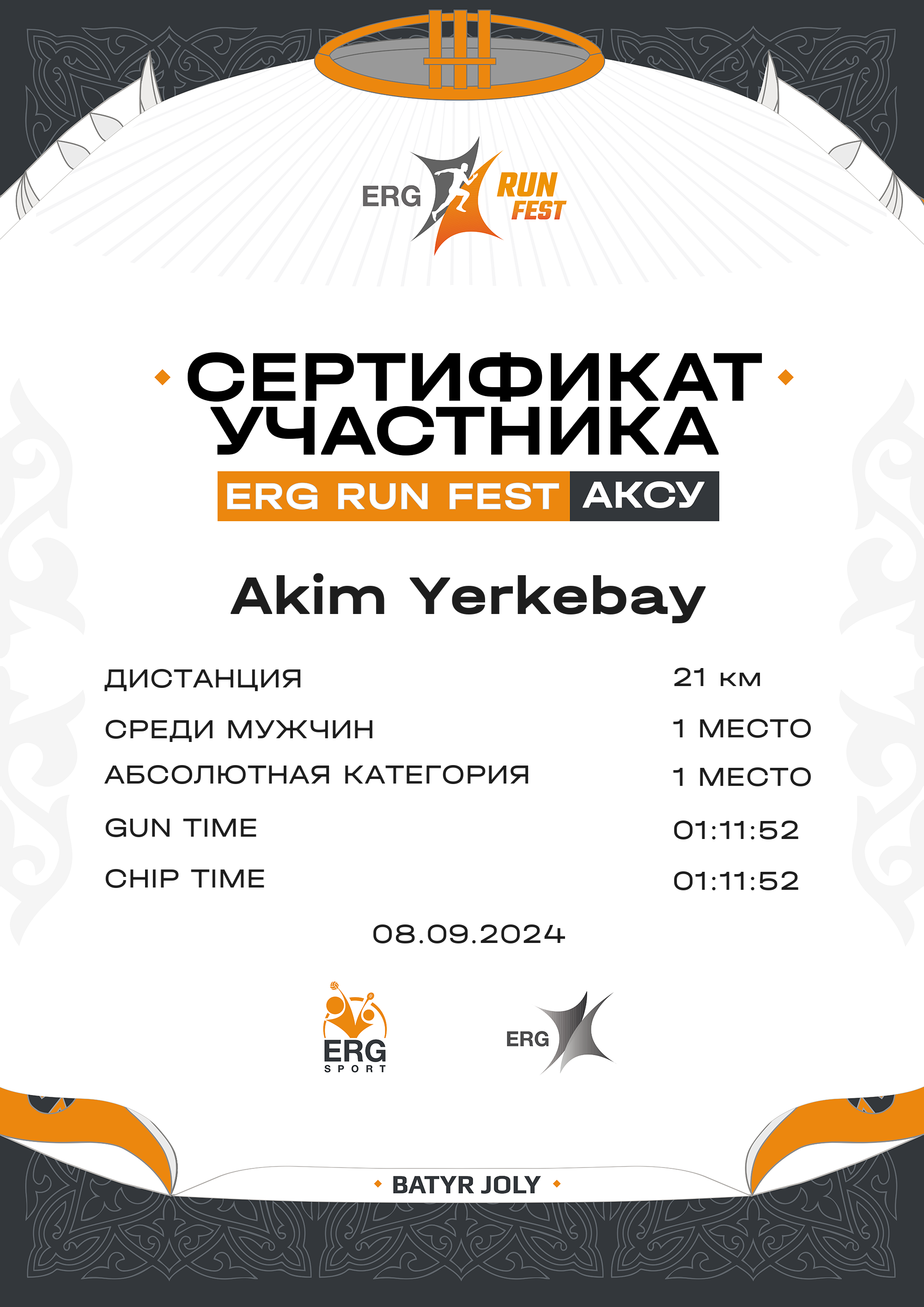 ОрынҚатысушыЕлГородНомер1.3 km3.6 km6.5 km8.8 km11.7 km14.0 km17.1 km19.4 kmФинишChip timePaceСертификат