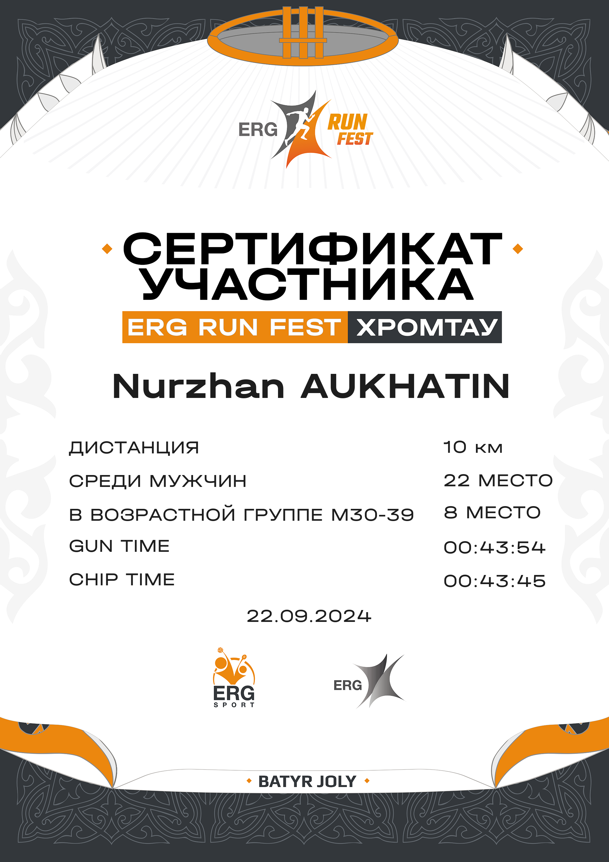 | 22 | Nurzhan AUKHATIN | ![]() | Aktobe | 440 | 00:07:34.00 | 00:17:53.00 | 00:29:16.00 | 00:40:06.00 | 00:43:54 | 00:43:45 | 4:22 | Скачать |