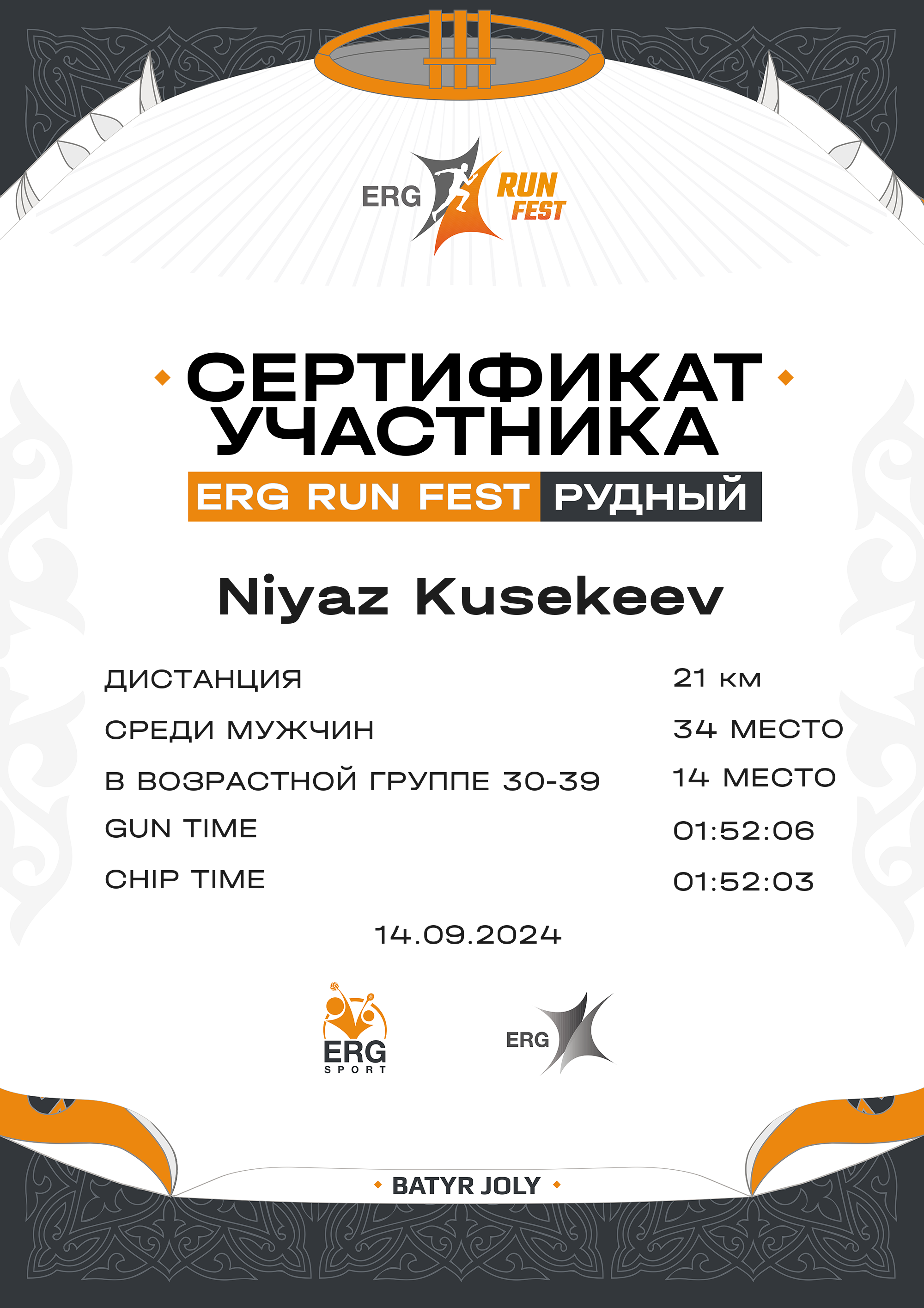 | 38 | Niyaz Kusekeev | ![]() | Костанай | 37 | 00:11:37.00 | 00:23:28.00 | 01:01:04.00 | 01:15:37.00 | 01:52:06 | 01:52:03 | 5:18 | Скачать |